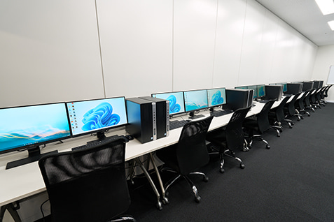 業界最新鋭のWindowsマシンが1人1台。サイドディスプレイ設置。プリンタやスキャナなどの周辺機材も充実している。