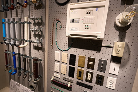 壁一面に広がる、配管や電気系設備のサンプル。リアルなシュミレーションをしながら空間デザインの学習ができる。