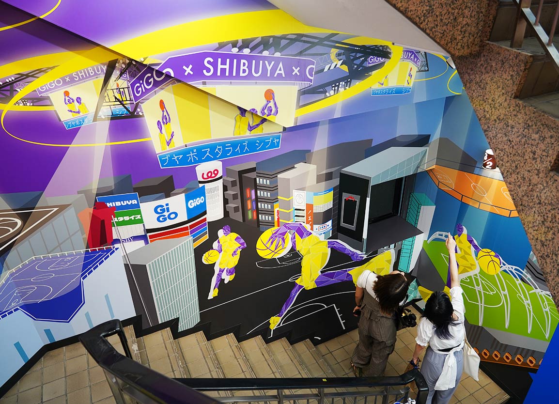 渋谷を拠点に活動するバスケットボールチーム「サンロッカーズ渋谷」と「B.LEAGUE(男子プロバスケットボールリーグ)」をより一層盛り上げるため、東京デザインプレックス研究所の学生がデザインしたウォールアートがGiGO渋谷に登場しました。デザインコンセプトは「渋谷ポスタライズ」。ポスタライズとは、バスケの用語でポスターに掲載されるような迫力のあるダンクシュートのことで、選手たちがダイナミックにプレイする様子を表現しました。完成したウォールアートは、ホームタウン渋谷の街全体が試合会場のアリーナになったような迫力があり、見る人を圧倒する仕上がりになっています。