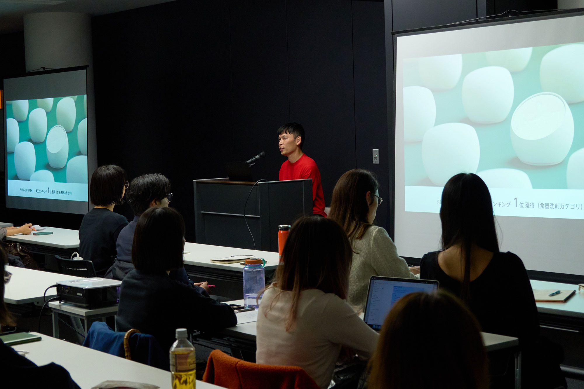 今井さん率いるkenmaのコンセプトは「企業の新たなFLAGSHIP(=看板商品)をつくる」です。FLAGSHIPは「象徴」×「具体」と定義され、象徴は企業が持つイメージ・テクノロジー・ビジョンなどで、それを具体的なものに作ったものがFLAGSHIPだと説明する今井さん。事例としてウェアラブルメモの「wemo」や、日本茶テイクアウトサービス「朝ボトル」、固形型食器用洗剤「SUNSUN WASH」などを紹介してくださいました。