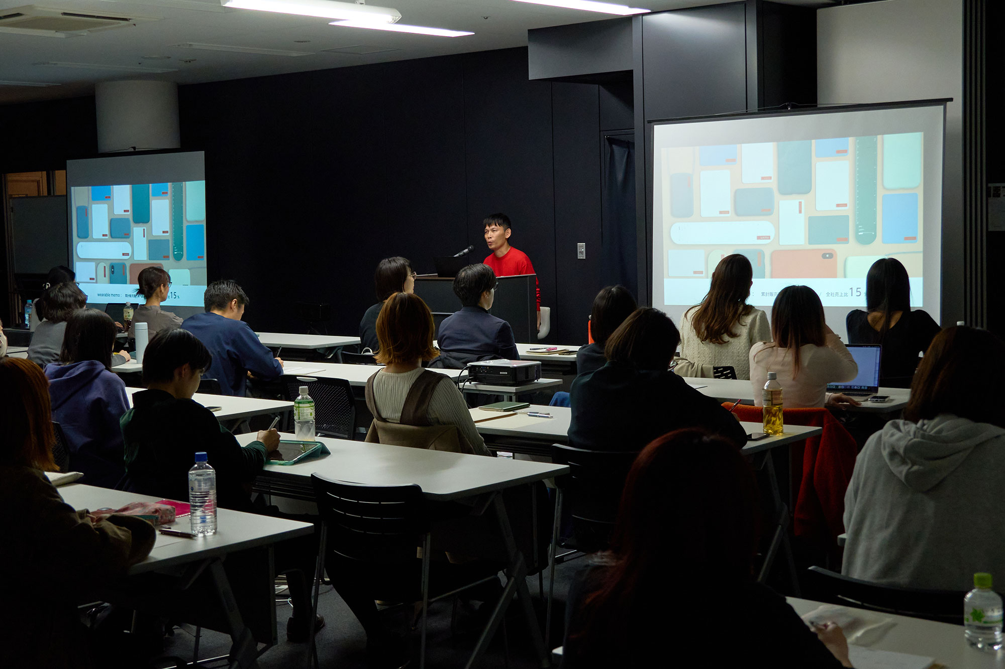 後半はワークショップを行います。今回は、「着眼点(新常識)で勝負できるようになるトレーニング」を今井さんから教わります。まずは対象物の「常識(before/これまで)」を挙げ、それに対して反対の意味の「新常識(after/これから)」を考えます。その新常識をもとに、新しいアイデアを発想していくという方法です。「ウェアラブルメモを例にすると、常識は“メモは身につけない”、新常識は“メモを身に着ける”で、アイデアは“身に着けるメモ” となります。」