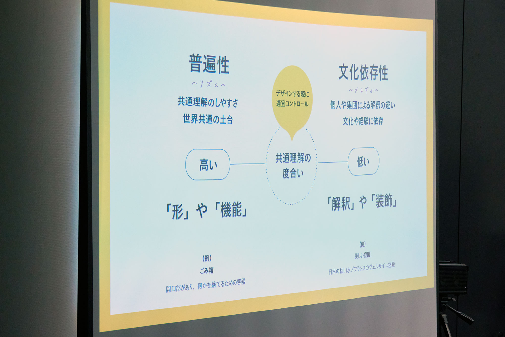 情報をデザインする際、德間さんは情報を「普遍性」と「文化依存性」に分けて考えます。例えば人間の基本的な感情は、文化や人種によらず、共通の顔の筋肉の動き(表情)として表現されます。記号の「矢印」は狩猟時代の矢を起源としており、世界中で方向を指し示す共通の記号として機能します。一方で、「〇」「×」「△」等の記号の解釈は国や集団によって異なり、個人や集団による解釈の違いがあります。こうした視覚的手がかりの共通理解を意識することが大切です。