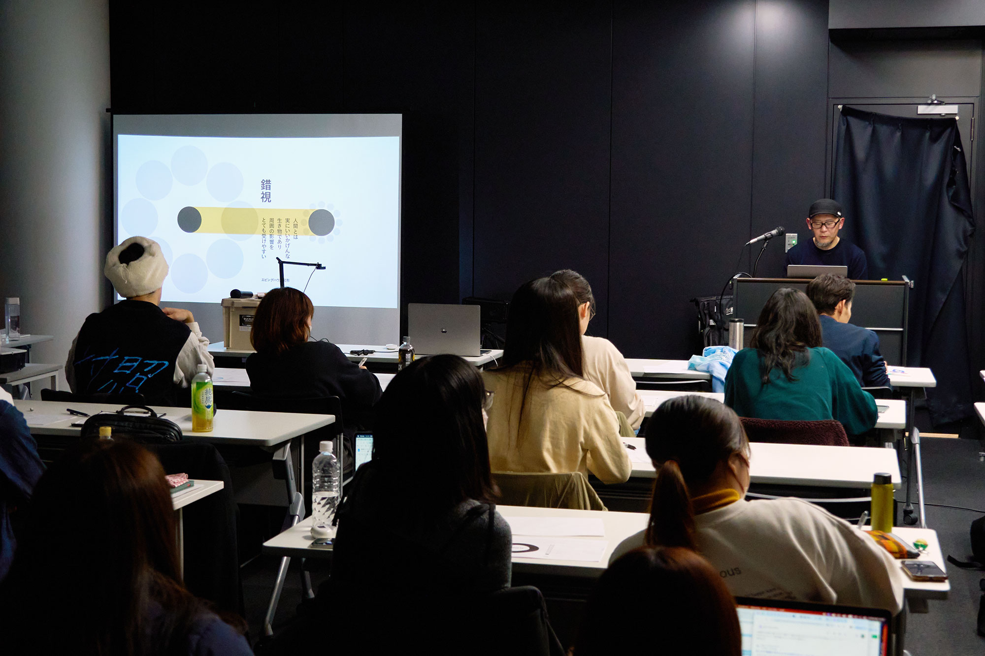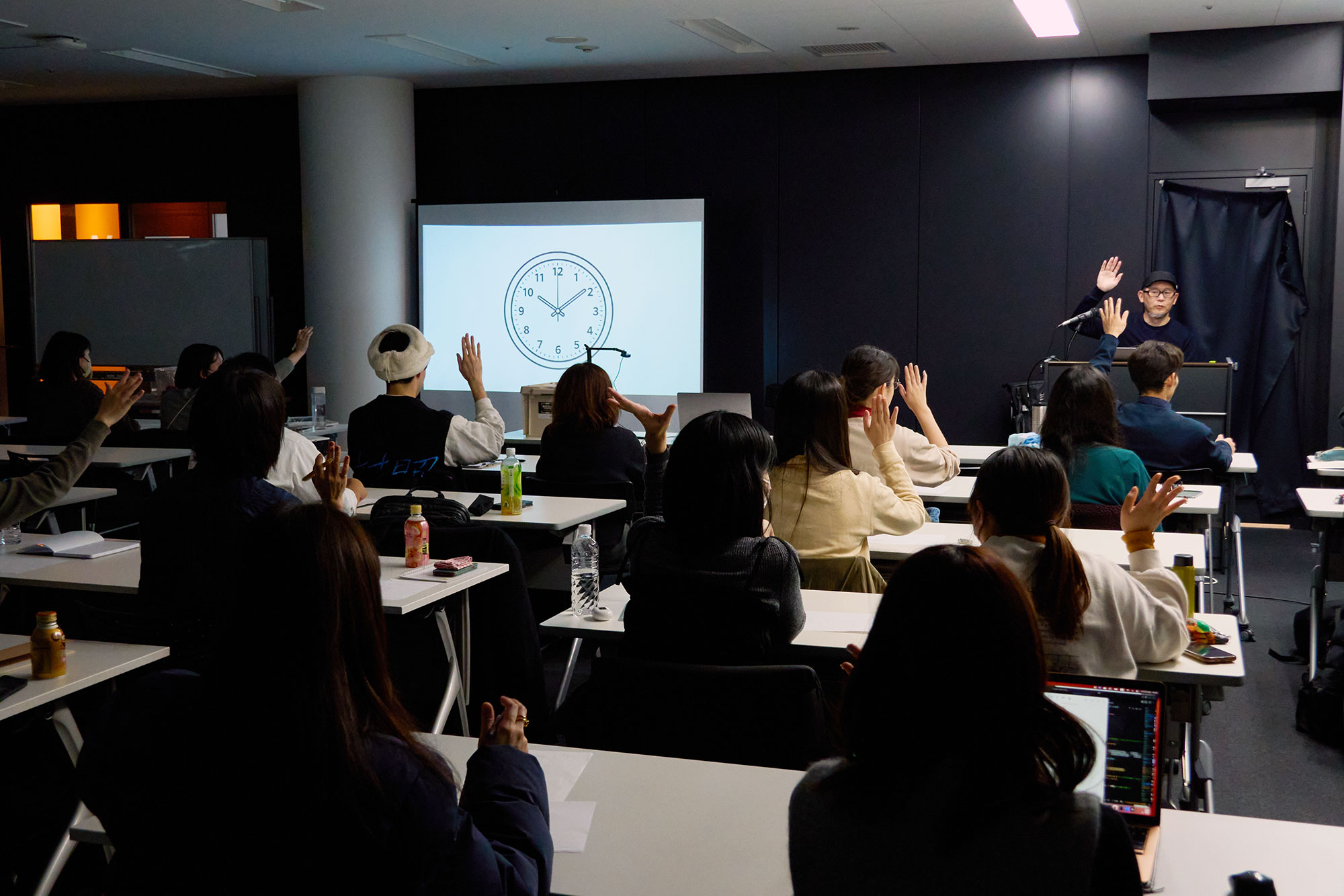 2日間に渡って実施されたワークショップ。まずアイスブレイクとして、10秒ごとに提示される様々なテーマに対して絵を描くワークです。「時計」というテーマでは、多くの受講生が「10時10分」付近を指す文字盤を描く中、とあるブランドの広告では「10時9分」「9時41分」に設定されている事例と共に、企業側の意図も紹介されました。また、「カメラ」のテーマでは一眼レフを描いた方とスマートフォンを描いた方に分かれるなど、時代や世代による認識の変化が浮き彫りになりました。