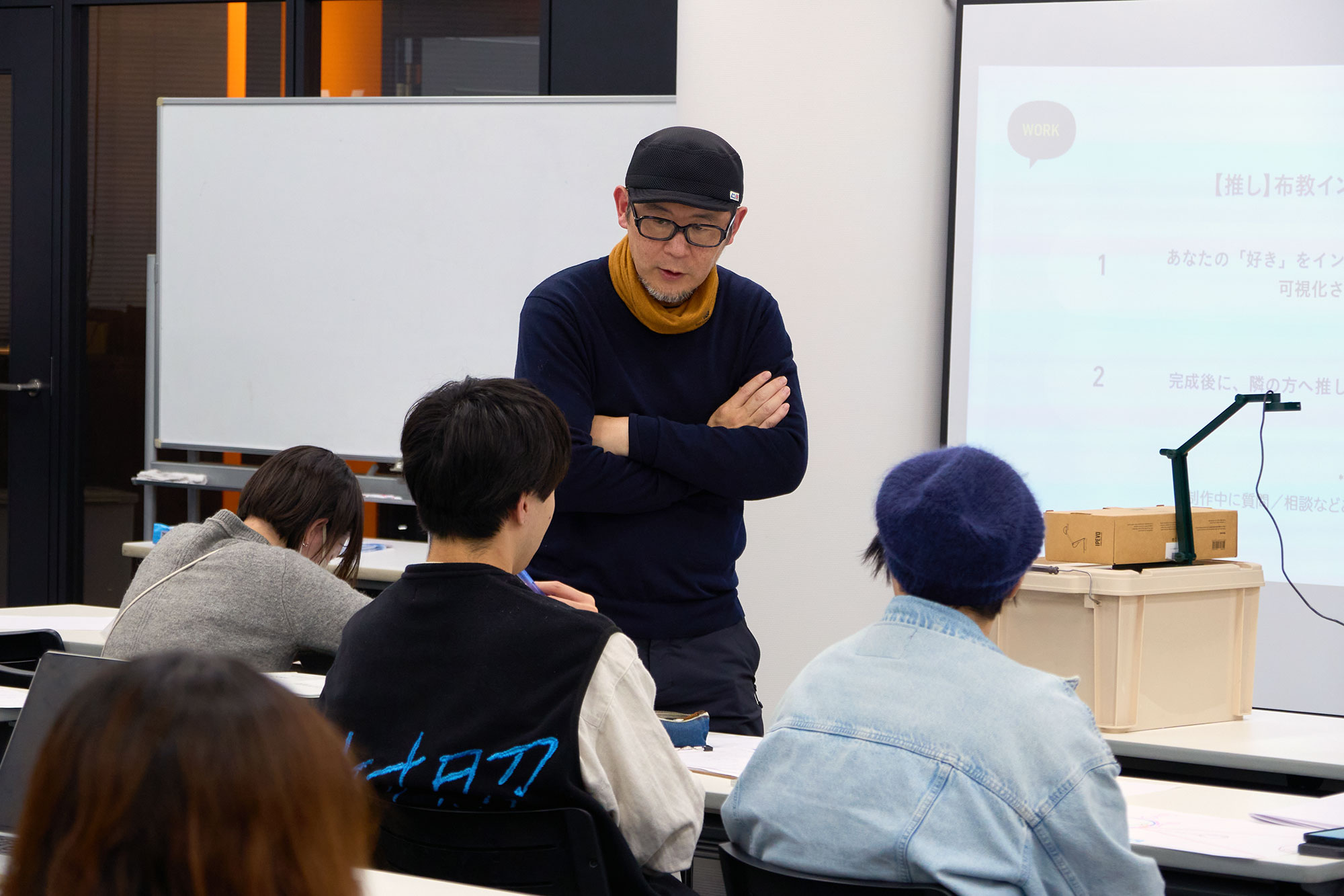 最後にプログラムの締めくくりとして、自身の「好きなもの(推し)」をリサーチし、他者へ伝えるためのインフォグラフィックスを作成しました。德間さんは学生に対し、「最も伝えたい事は何かと考え、相手に伝えるべきゴールを設定することが重要」とアドバイス。全ての情報を説明しきるのではなく、スキーマによる知識のパッケージを利用することで、より速く情報が理解され、意図的なズレによる創造的な飛躍を生むことで、深い理解や行動へと繋げるインフォグラフィックスを学びました。德間さん、2日に渡って充実したプログラムをありがとうございました!