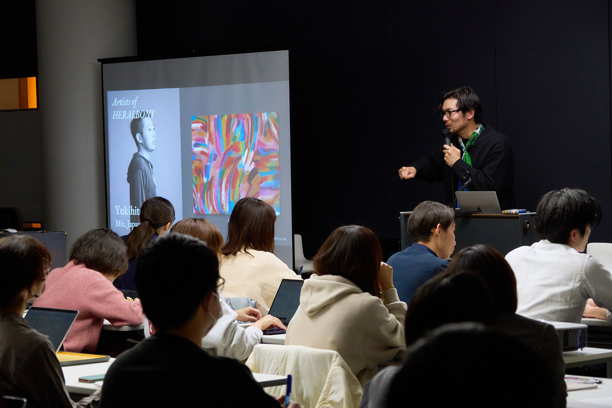今回は初めてのご登壇となる、株式会社ヘラルボニー クリエイティブディレクターの桑山知之さんにお越しいただきました。ヘラルボニーは、「異彩を、 放て。」をミッションに、障害のイメージ変容と福祉を起点に新たな文化の創出を目指すクリエイティブカンパニーです。「価値観を変えることは容易ではないからこそ、クライアントは単なる取引先ではなく、共に挑戦してくれるパートナーのような存在で心強い」と桑山さん。今回の講義では、異彩を放つ素晴らしい作品を世に届ける為に、桑山さんが大事にしていることをお話ししていただきます。