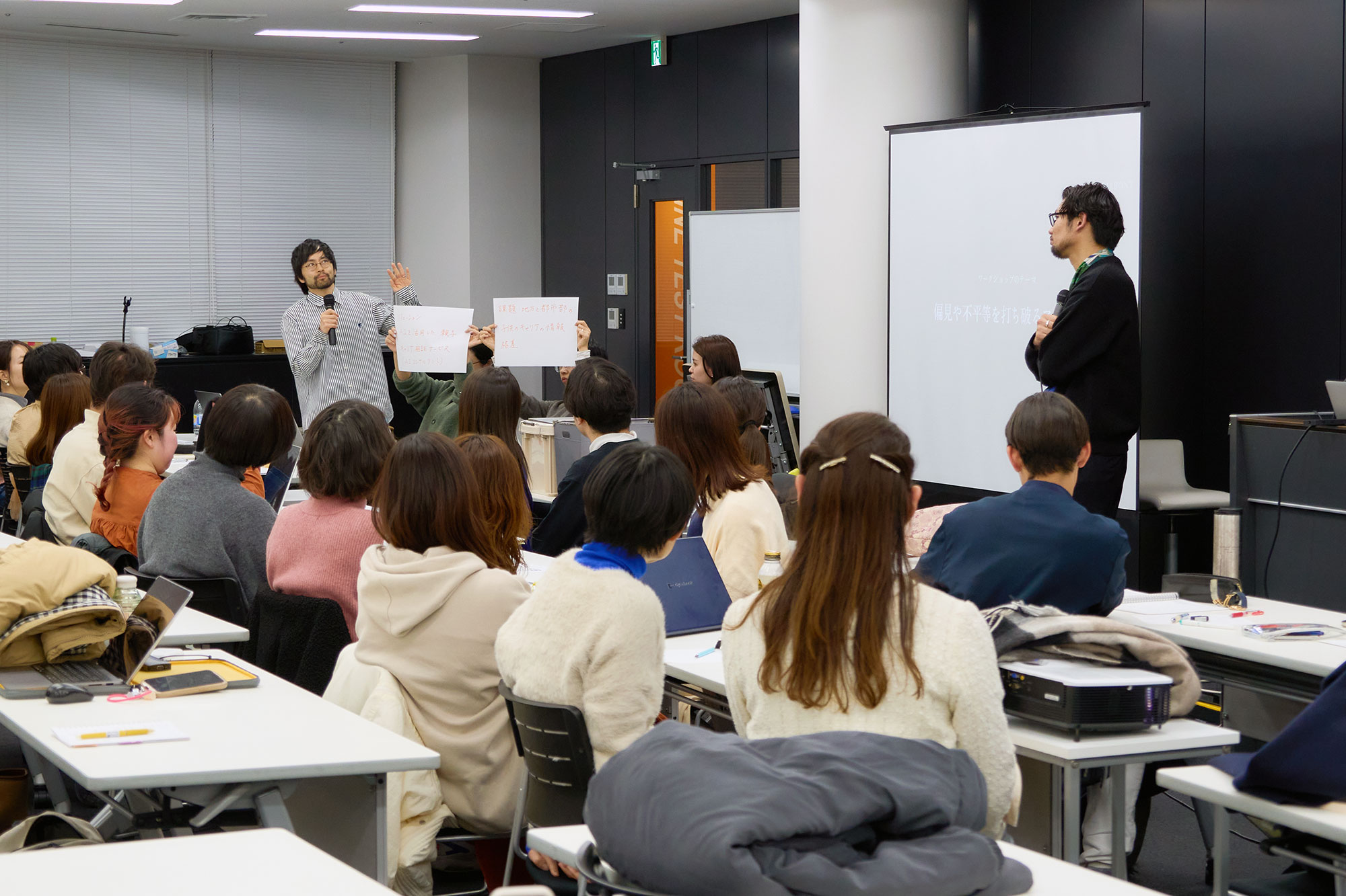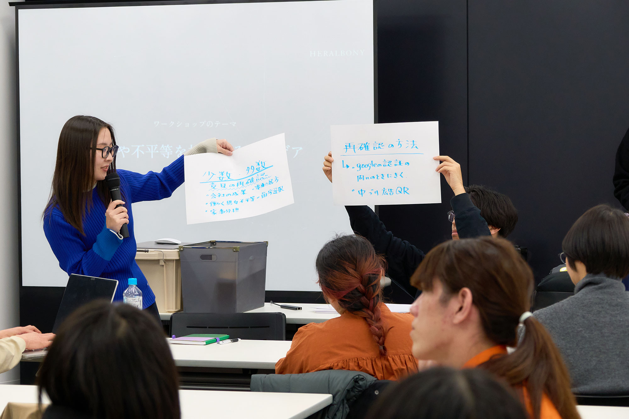 後半のワークショップでは、「偏見や不平等を打ち破るアイデア」をテーマにグループワークを行いました。とあるグループは「飲み会」に焦点を当て、お酒が苦手な人にとって、ソフトドリンクを飲みながら同じ会費を払う状況は不平等が生まれるのではないかと指摘。さらに、「飲み会」という名称自体が、“飲まなければならない”という無意識のバイアスを生んでいるのではないか、という意見も出ました。
