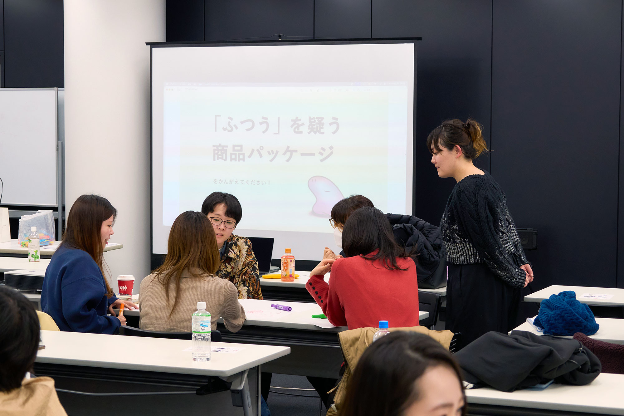 今回のワークショップでは、「『ふつう』を疑う商品パッケージ」をテーマに、学生たちは15分でグループワークを行いました。「既存の商品パッケージの在り方を疑い、こういう形ならもっと可能性が広がるだろう、という視点で考えてみてください」と小玉さん。アイデアが選ばれたチームには、小玉さんが紙にこだわって完成させたBULLETオリジナル年賀状が贈られるという特典も発表されました。短い時間ながらも各チームの話し合いは活発に進み、様々な意見が飛び出しました。