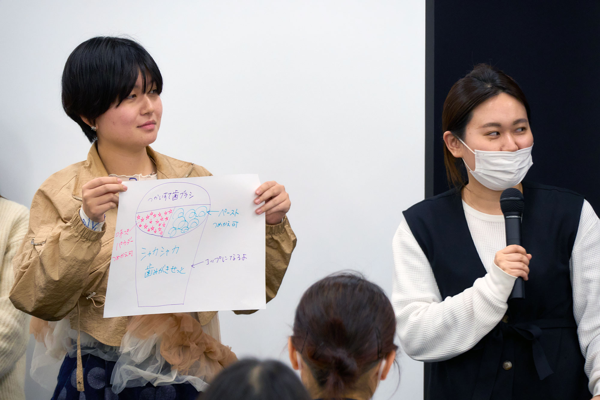 見事小玉さんに選ばれたのは、『子どもが楽しめる歯磨きセット』を考案したチーム。お菓子のヤンヤンつけボーから着想を得て、主流のチューブ型歯磨き粉にはない「つける楽しさ」を取り入れたアイデアを考案しました。講評では「毎日やらなければいけない歯磨きと、子どもが好きな遊びを組み合わせた点に面白さが光っていた。地続きではない2つの異なるアイデアを結びつけたことが面白く、人間らしい発想だと感じます」と評価されました。