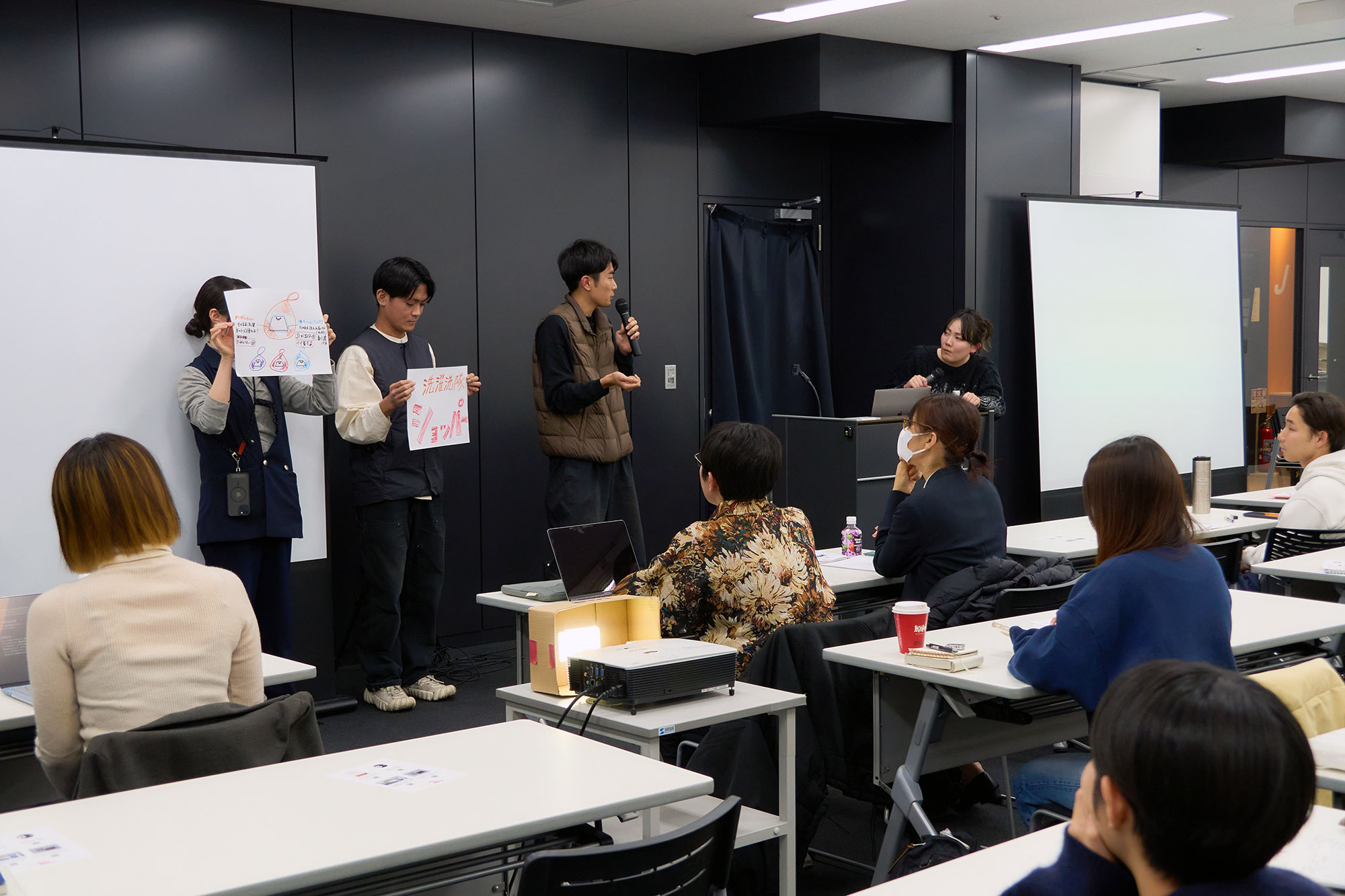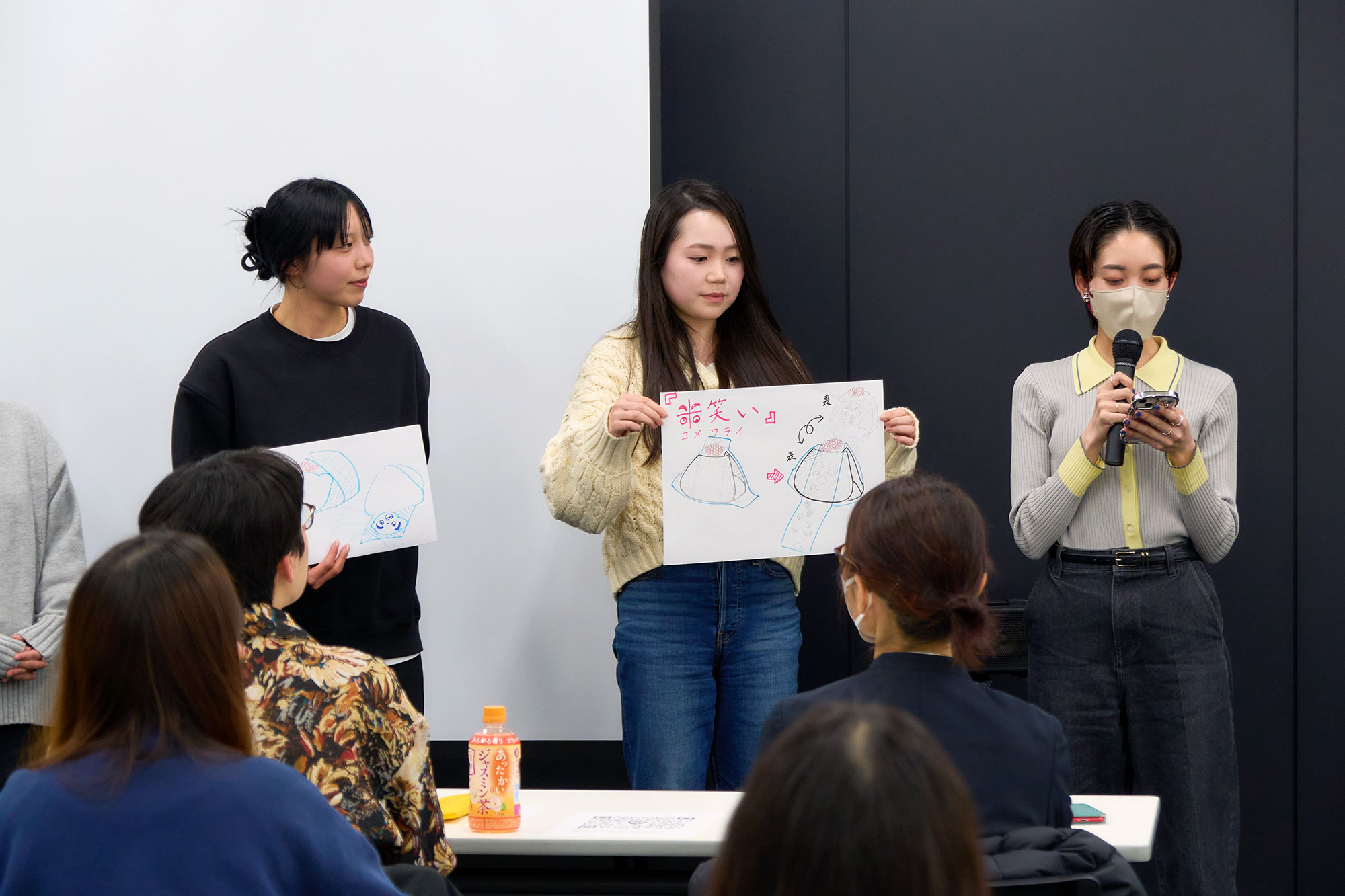 他のチームからもユニークなアイデアが発表されました。「他人には見えない、でも自分にはわかる」というコンセプトのカスタマイズできるブックカバーや、戦隊モノ特有のカラーリングでショッピングバックと洗濯ネットの両方の役割を持つ『洗濯洗隊』、さらにコンビニおにぎりという身近なパッケージに海苔の形で表情が変わって見える『福笑いおにぎり』など、“ふつう”を疑う発想を活かしたさまざまな提案が見られました。